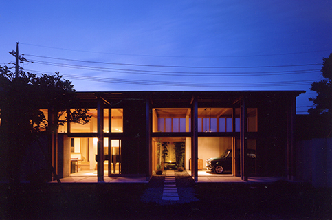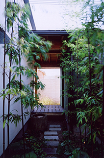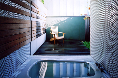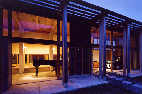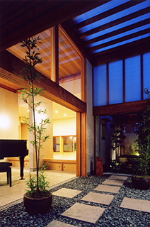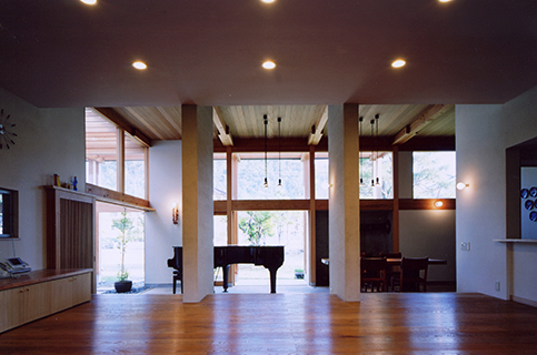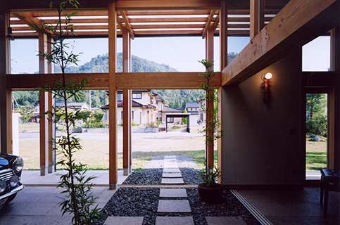 引き戸を全開し、土間玄関と一体となった土間リビングで薪ストーブにあたりながら、大好きな車を眺めたり、お庭を眺めたり、ピアノを弾いたり、日々の生活を楽しみながら暮らされています。半屋外の縁側を渡った先にはテラスのついたお風呂があります。四季折々の風景を楽しみながら、まるで露天風呂に入っているかのような開放的な気分になります。
