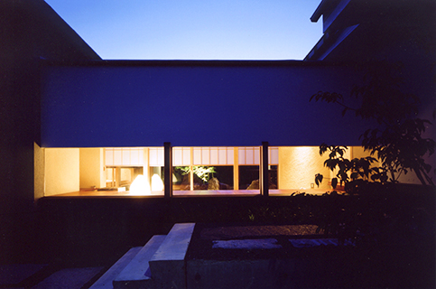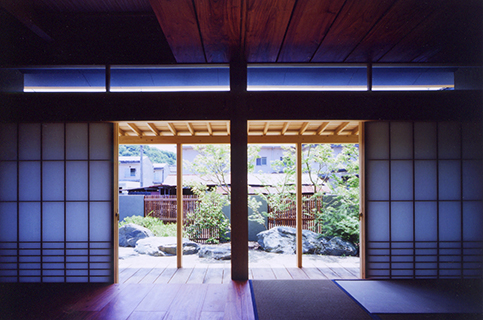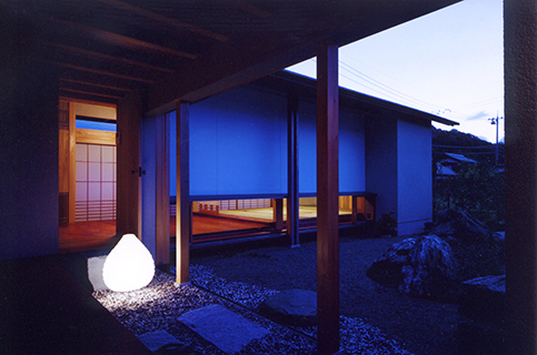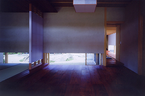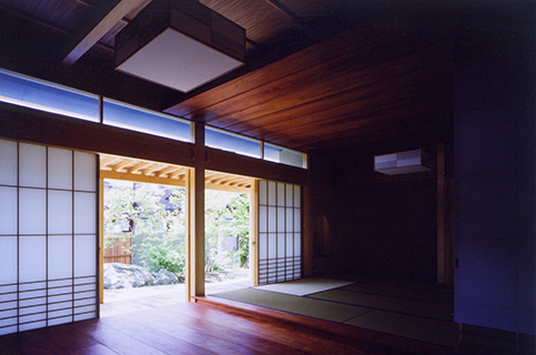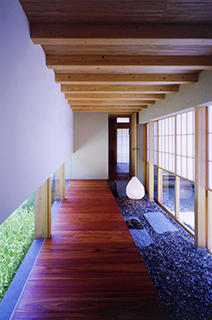 既存の住宅に増築された水屋のある離れです。 既存部分とは砂利敷きの土間に花梨の式台や飛び石を備えた渡り廊下でつなぎ、非日常空間へのアプローチの演出をしています。 また材料や工法にこだわり、離れの床板や天井には福山市の家具屋から特別に手に入れることのできた花梨の無垢板を使い、昔ながらの工法で泥壁や漆喰をつくり、外壁・内壁を塗り上げています。職人さんと時間をかけてつくりあげられた、小さいながらも手の込んだ離れです。