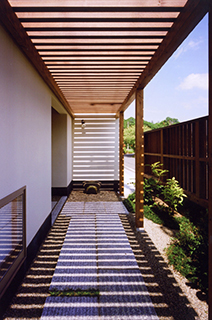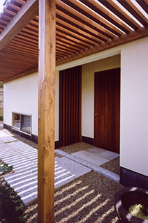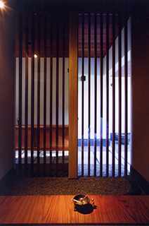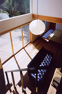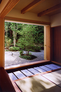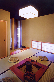 土壁の和室は取外しのできる炉が切ってあり、花梨の床板の前面は格子窓とし、外部の風景を床の間越しに取り入れたりと前衛的な和室となっています。