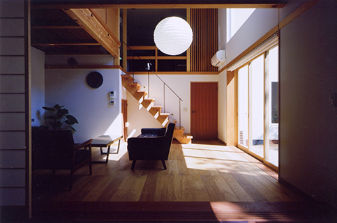 また敷地の北側の崖により日照が遮られるため、建物をできるだけ南側に引き、吹抜けとしたリビング上部の壁面も開口部とすることで建物全体に光を取り入れています。