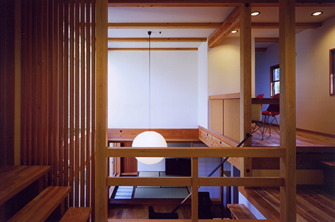 家族の気配をどこにいても感じることができるように1階のリビング、中2階のダイニング、2階のフリースペースが吹抜のスキップフロアでつながっています。