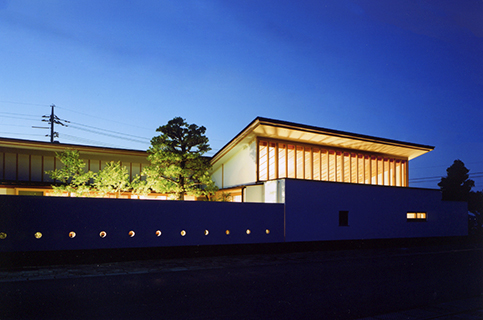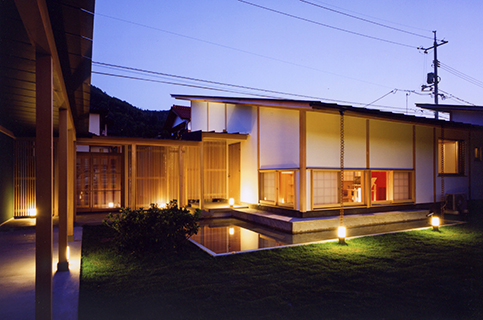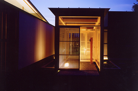 水盤をアプローチ周囲に配し、夜には水面がゆらゆらと月明りに照らされ、幻想的な雰囲気を醸し出しています。