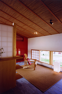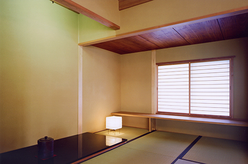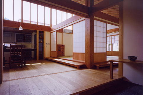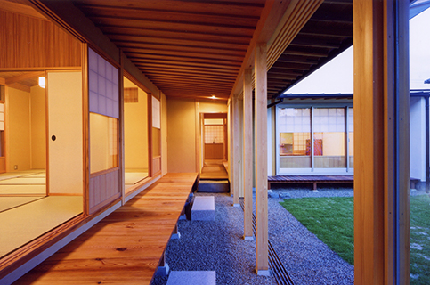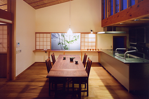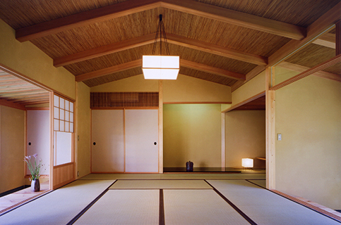 玄関は鉄平石敷きの土間リビングとなっており、土足のままちょっとした来客の対応ができます。室内は欅の大黒柱を中心とした田の字のプランニングとなっており、壁面上部に設けられたFIX窓からは周囲の山々が眺められ、四季の移ろいを楽しめるようになっています。飛び石を渡った先の奥の間は中庭・坪庭に囲まれた書院や縁側を備えた18畳の大広間となっています。