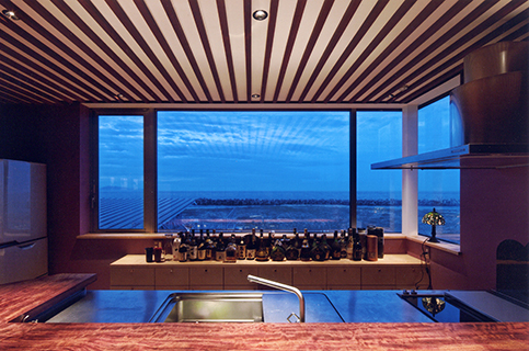 2Fにあるシーサイドバーにはブビンガの無垢板のカウンターを配し、カウンター越しに日本海を眺めながらゆったりとした時間を過ごすことができます。