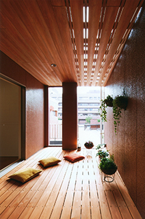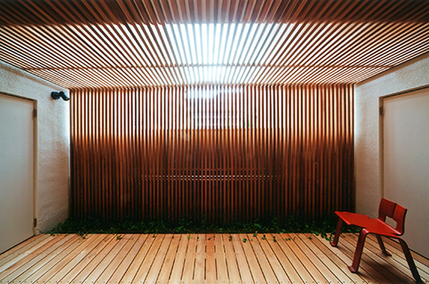 室内天井の木製格子を屋外テラスまで延長することにより、内外空間に一体感を持たせています。この屋外テラスの天井格子は壁際に立てた立格子とも繋がり、隣家とのプライバシーを守り、屋外テラスでは屋外の部屋として落ち着いた雰囲気で過ごす事ができます。