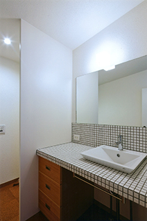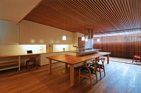 1階は料理好きな奥様の「キッチンに住む」をコンセプトとして計画しており、周りに大きなテーブルを取り付けた流し台を中心にキッチン、リビングをワンルームとしています。