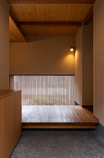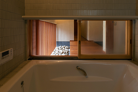 露地のような狭いアプローチを抜け、玄関扉を開けると、お風呂からも眺めることのできる室内外に繋がった坪庭が眼前に広がるという、旧家の町家を意識した演出を仕掛けています。
