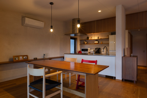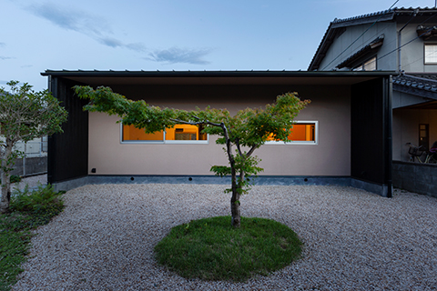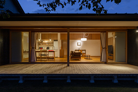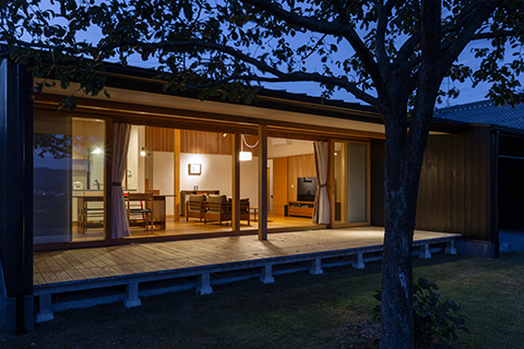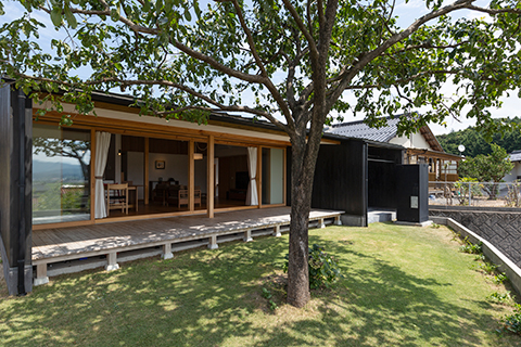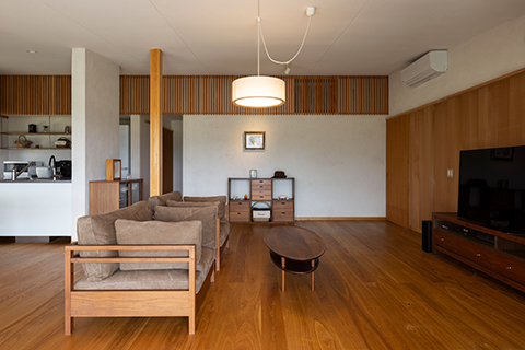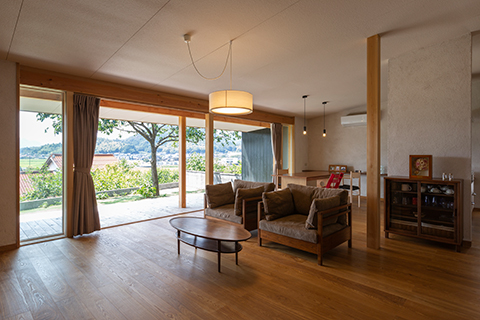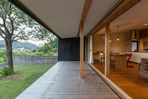 眼前に田園風景が広がる高台に建つ平屋の住宅です。 ワンルームのLDKには余計な景色ができるだけ入り込まないように、軒の出や軒の高さを現場で何度も微調整し、袖壁を出すことで額装された絵画のように、眼前の豊かな田園風景を切り取っています。 また屋根の掛かった奥行き2.5mの広々としたデッキテラスを併設しています。雨の日や日差しが強い日でも、デッキテラスでお花見やBBQをしたり、テントやプールを出したり、柿を干したり、四季折々で楽しく使われています。