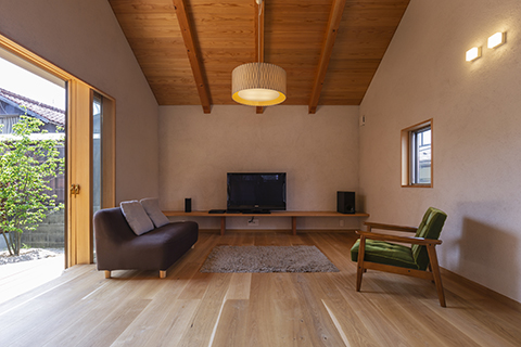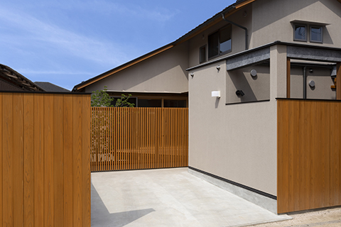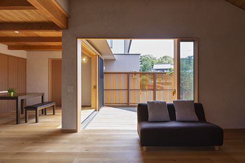 通風と午前中の日照を確保するために、格子塀に囲われたテラス付の中庭を敷地中心に設け、その中庭に面してL型にLDKを配しています。