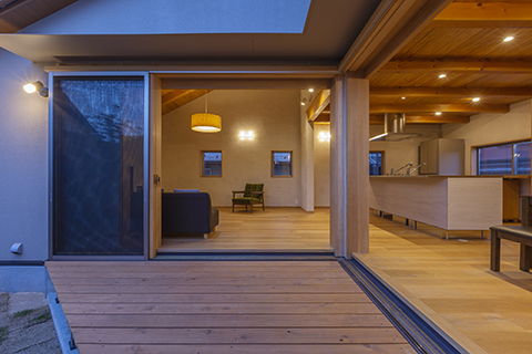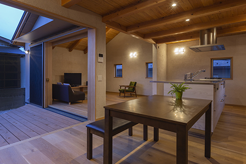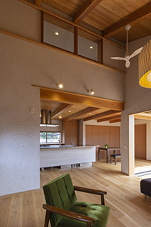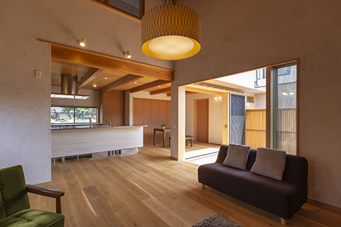 LDKはキッチンを中心としたワンルームとし、低い天井と吹抜の天井とを混在させることで、空間構成に変化を持たせ、平面的にも断面的にも楽しめる工夫をしています。