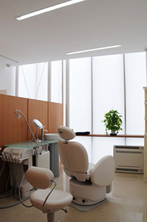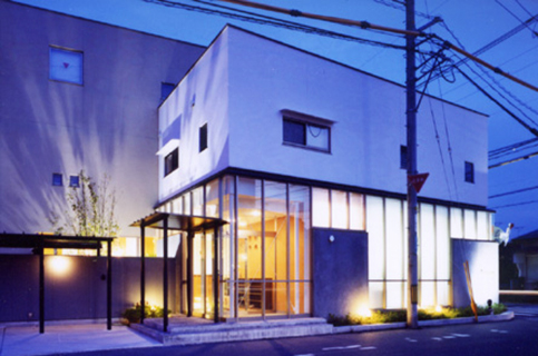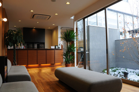広瀬の左官職人による土壁とナラのフローリングで仕上げられた温かみのある待合室からは、少しでも患者さんの心が和むように、お庭が眺められるようになっています。内部はガラス張りの明るい診療室となっており、夜にはガラス越しに室内の明かりがおんぼらともれ、街にシンボリックに佇んでいます。