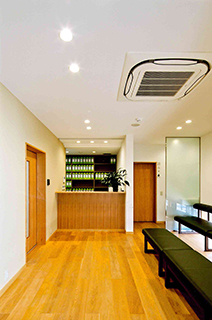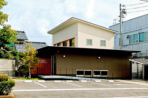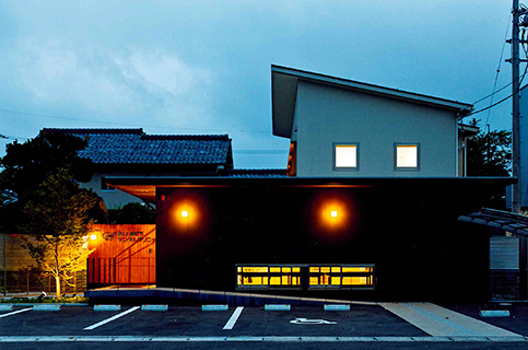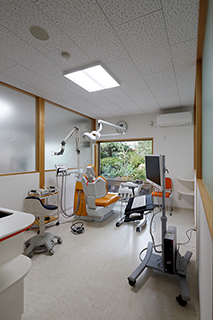 鳥取県境港市に建つ歯科医院です。 4室ある治療室は完全個室とし、患者さんのプライバシーに配慮をしています。一方で患者さんが閉塞感を感じないように、各個室の仕切り壁の上部は半透明のガラスとし、正面は治療を受けながら同敷地内のお住まいの庭が借景として眺められるようにしています。技工室は技工士さんと使い勝手や使用色など念入りに打ち合わせをし、シンプルで機能的な技工室となっています。また2Fには講義室があり、先生やスタッフが日夜勉強会をされています。