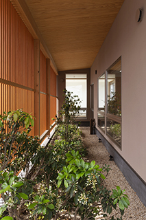 治療室前には立格子に囲われた前庭があり、日中は立格子越しに庭や治療室に柔らかな陽が入り、玄関を入ると前庭の全景が、そして治療室からは前庭の木々と、格子越しに大山の雄姿が眺望できます。
