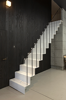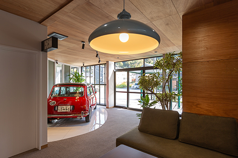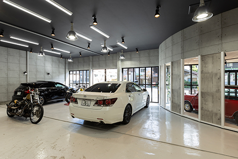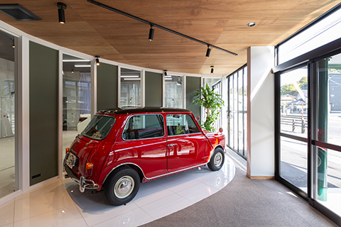 展示スペースは弧を描いたスリット窓付の屏風のような壁面とし、オーナーの愛車、赤のミニクーパーが建物内外から際立って見えるようにしています。