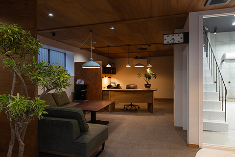 倉庫として使用されていた建物を改修し、大空間の中に作業場と展示スペースに受付、商談スペース、休憩室を設けています。外部から作業の様子がよく見えるように、また車の出し入れができるように、既存の壁やシャッターを撤去し、9号線側は全面ガラス戸としています。